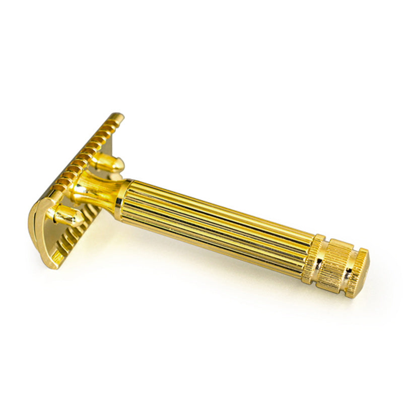 La zigrinatura alla base semplifica la sostituzione delle lame. Realizzato interamente in ottone viene in seguito sottoposto al processo di placcatura di colore oro.