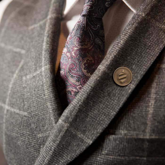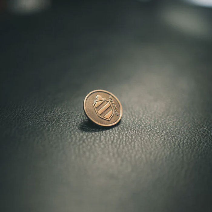 Rendi il tuo look pi elegante con la spilla Pomp Shield, realizzata in metallo con una finitura antica in oro patinato.